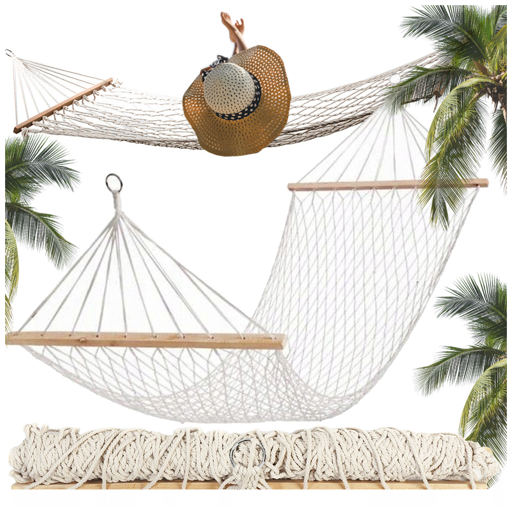 Φτιαγμένη από ανθεκτικό πλεκτό δίχτυ για εξαιρετική αντοχή και διαπνοή, αυτή η αιώρα είναι ιδανική για να ξαπλώνετε και να χαλαρώνετε κάτω από τον ήλιο. Ενισχυμένη με δύο ξύλινα σταυρόξυλα για σταθερότητα και ευκολία εισόδου/εξόδου, αυτή η αιώρα σάς προσφέρει άνεση όλη μέρα.