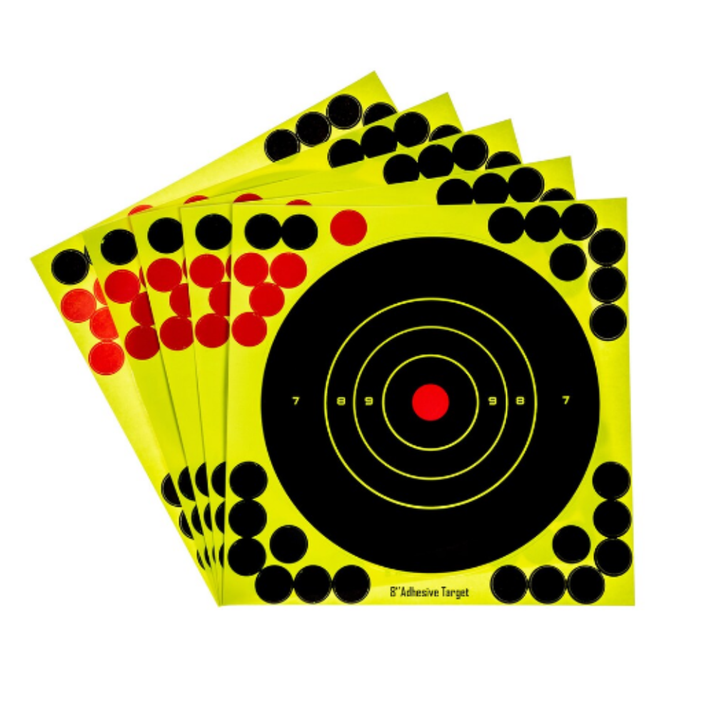 Σετ πέντε αυτοκόλλητων στόχων της Blackfire. Οι μοναδικοί αυτοί στόχοι τοποθετούνται εύκολα σε χαρτόνι ή κόντρα πλακέ. Με κάθε βολή δημιουργείται μια φωτεινή οπή υψηλής αντίθεσης, η οποία μπορεί να καλυφθεί με κυκλικό αυτοκόλλητο σε μαύρο ή κόκκινο χρώμα.